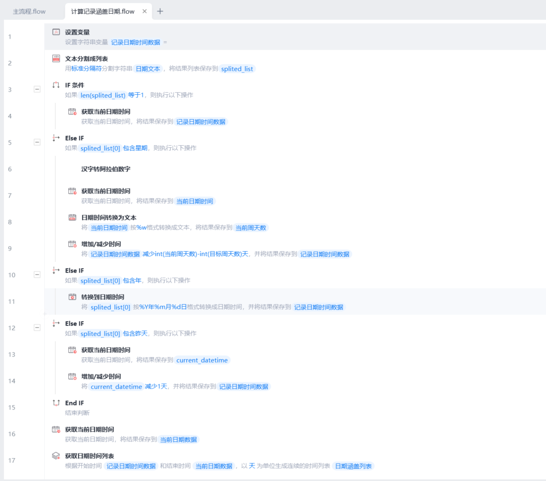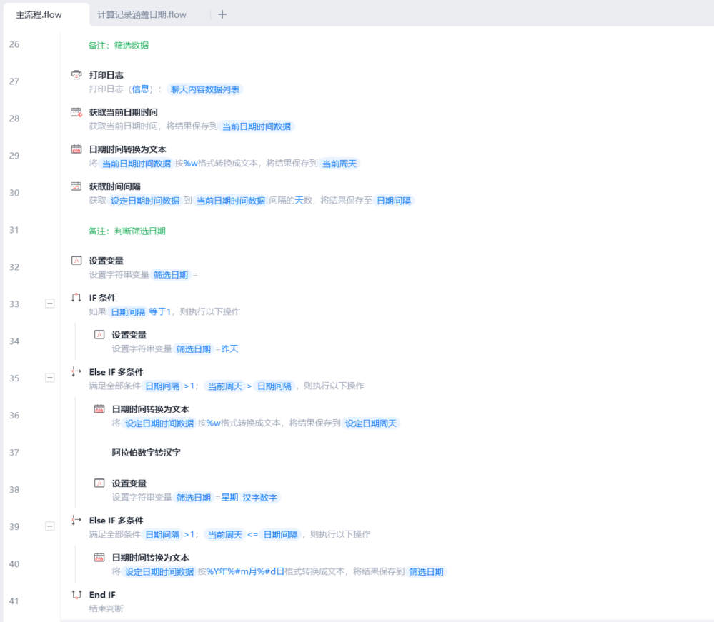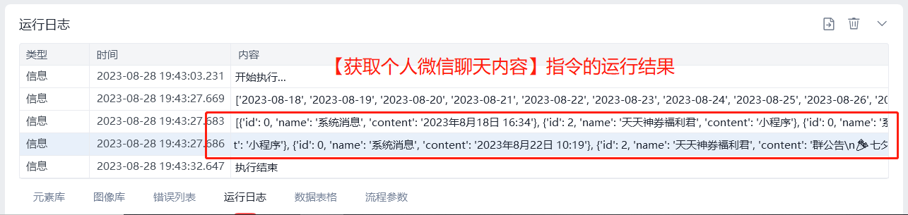 - 如何提取到指定天数的记录内容:【获取个人微信聊天内容】指令得到的结果是一个列表嵌套字典的格式,每个字典为一条信息,而且每天的第一条记录也为日期,可以通过定位第一条日期记录的方式来截取列表数据。