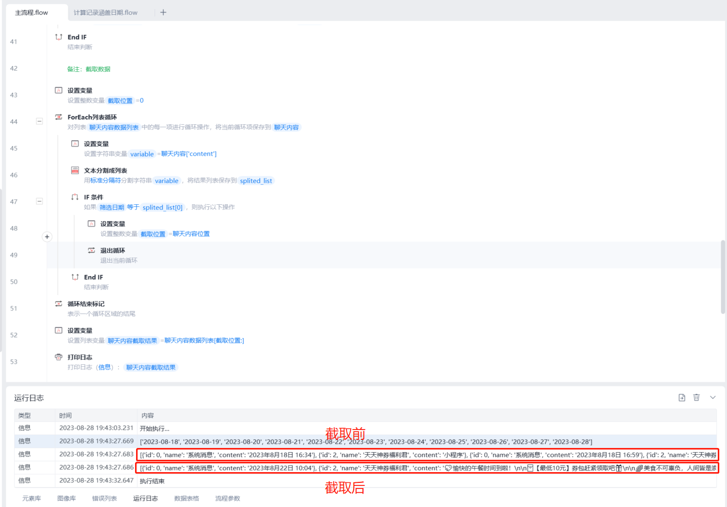 - 测试时是截取指定日期到今日的记录内容,也可以在后面做一个截取动作,只获取指定日期一天的数据,需要通过定位指定日期后一天的时间来做截取;