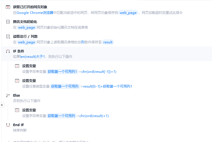 思路:当腾讯文档初始化后,获取总列数后加一就可以得到第一个可用列,可封装成指令,将获取第一个可用列的变量设置为输出参数即可