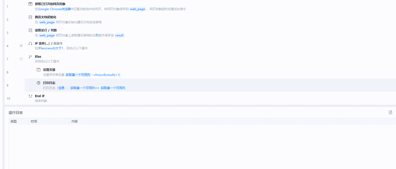 思路:当腾讯文档初始化后,获取插入列的内容,通过表格内容反转来判断第一个聂荣是否为空,就可以得到第一个可用行,可封装成指令,将获取输入行、输出列的变量设置为输入、输出参数即可